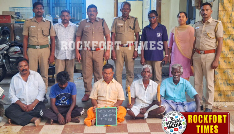 திருச்சி, ராம்ஜி நகர் அருகே வன உயிரின பொருட்கள் கடத்தி வரப்படுவதாக திருச்சி மாவட்ட வனத்துறை அதிகாரிகளுக்கு ரகசிய தகவல் கிடைத்தது. அதன் அடிப்படையில் ராம்ஜி நகர் பகுதியில் வனத்துறை அதிகாரிகள் வாகன சோதனையில் ஈடுபட்டிருந்தனர். அப்போது திருச்சியை நோக்கி வந்த ஒரு காரை சோதனை செய்ததில் அதில் இரண்டு யானைத் தந்தங்கள் இருந்தது. அந்த தந்தங்களை விற்பனைக்காக கடத்தி வந்தது விசாரணையில் தெரியவந்தது. அதனைத் தொடர்ந்து அந்த இரண்டு தந்தங்களை பறிமுதல் செய்த வனத்துறை அதிகாரிகள் அதனை கடத்தி வந்த ராமசாமி(65), திருப்பதி(70), ஞானசேகரன்(61), சுப்ரமணி(58), கார்த்தி(29) ஆகிய 5 பேரை கைது செய்தனர். அந்தத் தந்தங்கள் யாருக்கு, எங்கு கடத்திச் செல்லப்பட்டது என்பது குறித்து அவர்களிடம் தொடர்ந்து விசாரணை நடத்தப்பட்டு வருகிறது.