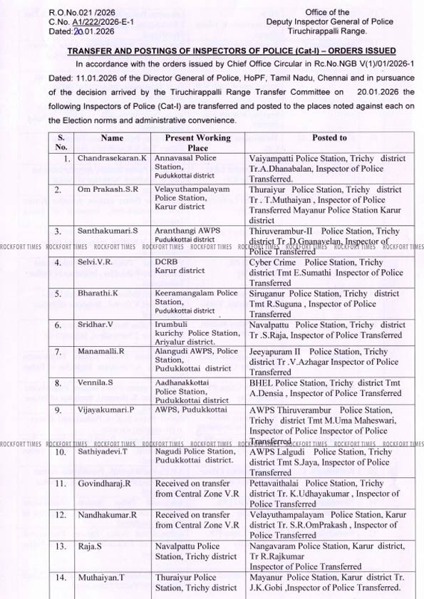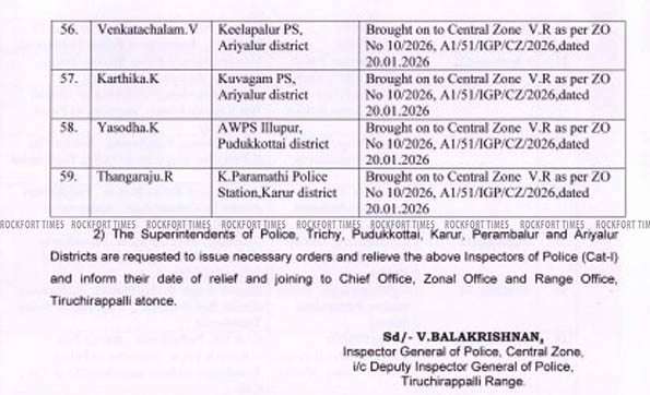 திருச்சி மத்திய மண்டலத்தில் 59 காவல் ஆய்வாளர்கள் பணியிட மாற்றம்…!