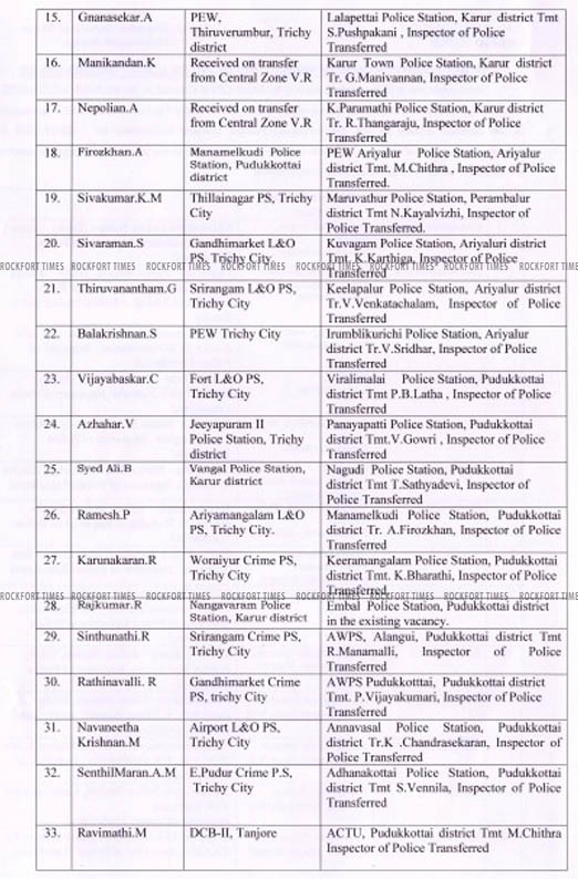 ஒரே பகுதியில் தொடர்ந்து மூன்று ஆண்டுகள் பணியில் இருந்த 59 காவல் ஆய்வாளர்களை தேர்தல் காரணமாக பணியிட மாற்றம் செய்து மத்திய மண்டல காவல்துறை தலைவர் பாலகிருஷ்ணன் உத்தரவிட்டுள்ளார். அவர்கள் பெயர் விவரம் வருமாறு:-