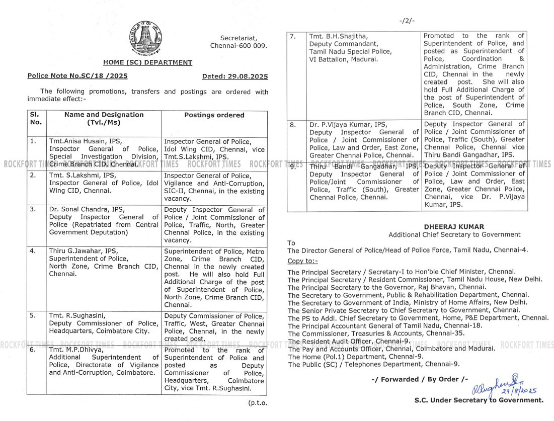 தமிழக அரசின் கூடுதல் தலைமை செயலாளர் தீரஜ் குமார் இன்று (ஆகஸ்ட் 29) வெளியிட்ட உத்தரவின் படி, மாநில காவல் நிர்வாகத்தில், 9 ஐ.பி.எஸ் அதிகாரிகள் பல்வேறு நிர்வாக காரணங்களுக்காக பணியிடமாற்றம் செய்யப்பட்டுள்ளர். அதன் விவரம் வருமாறு: