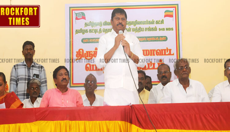 தமிழ்நாடு விவசாய தொழிலாளர்கள் கட்சி, தமிழக கட்டிட தொழிலாளர்கள் மத்திய சங்கம், தமிழ்நாடு அமைப்புசாரா தொழிலாளர்கள் மத்திய சங்கம் சார்பில் திருச்சி மாநகர் மாவட்ட பொதுக்குழு கூட்டம் கருமண்டபத்தில் உள்ள ஒரு திருமண மண்டபத்தில் நடைபெற்றது. கூட்டத்திற்கு மாவட்ட தலைவர் சுப்பிரமணியன் தலைமை தாங்கினார். மாவட்ட செயலாளர் செந்தில் வரவேற்று பேசினார். நிர்வாகிகள் பாலகிருஷ்ணன், அண்ணாதுரை உள்ளிட்ட மாவட்ட நிர்வாகிகள் முன்னிலை வகித்தனர். கூட்டத்தில் தமிழக அரசின் கட்டுமான நல வாரிய தலைவரும், மத்திய சங்கத்தின் நிறுவனருமான பொன்.குமார் பங்கேற்று சிறப்புரை ஆற்றினார். கூட்டத்தில், கட்டுமான தொழிலாளர்களுக்கு விபத்து மரண, இழப்பீட்டு தொகை 5 லட்சமாக இருந்ததை 8 லட்சமாக உயர்த்தி வழங்கியது. சென்னையில் கட்டுமான தொழிலாளர்களுக்கு முதியோர் இல்லம் கட்ட அனுமதி வழங்கியது. தொழிலாளர்களின் குழந்தைகளுக்கு பி.எச்.டி. பட்டப் படிப்பிற்கு ஒரு வருடத்திற்கு ரூ.15 ஆயிரம் விதம் 3 ஆண்டுகளுக்கு 45 ஆயிரம் வழங்கியது. தொழிலாளர்களுக்கு மருத்துவ அட்டை வழங்கியது போன்றவற்றுக்காக தமிழக அரசுக்கும், தமிழக முதலமைச்சர் மு.க.ஸ்டாலின், தொழிலாளர் நலத்துறை அமைச்சர் கணேசன் ஆகியோருக்கு நன்றி தெரிவித்து தீர்மானம் நிறைவேற்றப்பட்டது.கூட்டத்தில் திருச்சி மாவட்ட நிர்வாகிகள் பொன்னுச்சாமி, சுவாமிநாதன், ஸ்ரீரங்கன், ஜெயராமன், மணிவேல், சீரான், சந்திரன், மணி, வெங்கடேசன், பிச்சை, செல்வம், சிவபெருமாள் உள்ளிட்ட பலர் கலந்து கொண்டனர்.
