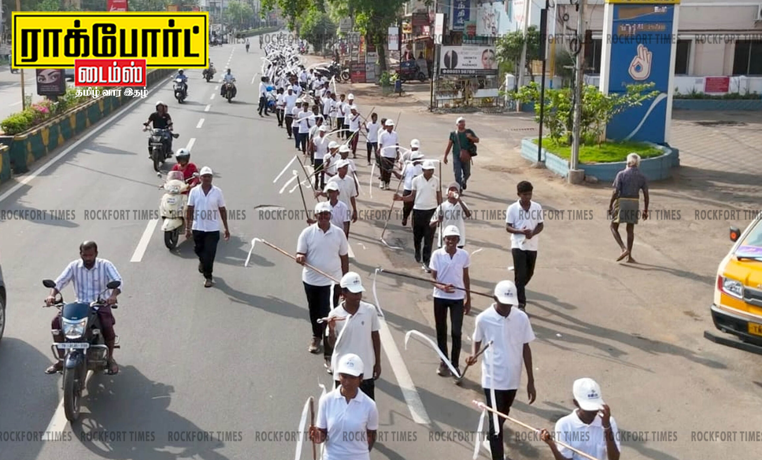 நடைபெற உள்ள 2026 சட்டமன்றத் தேர்தலில் 100% வாக்களிப்பை உறுதி செய்யும் வகையிலும், அனைவரும் தவறாது தங்களது ஜனநாயக கடமையை நிறைவேற்ற வேண்டும் என்பதனை வலியுறுத்தியும் மை பாரத் கேந்திரா திருச்சிராப்பள்ளி மற்றும் வீரமங்கை வேலுநாச்சியார் இளையோர் சங்கம் இணைந்து நடத்திய வாக்காளர் விழிப்புணர்வு பேரணி திருச்சியில் நடைபெற்றது. ஆயிரக்கணக்கான சிலம்ப வீராங்கனைகள் சிலம்பம் சுற்றியவாறு கலைக்காவிரி நுண்கலை கல்லூரியிலிருந்து சுமார் 3 கிலோ மீட்டர் தூரம் பேரணியாக சென்று விழிப்புணர்வு ஏற்படுத்தினார்கள்.