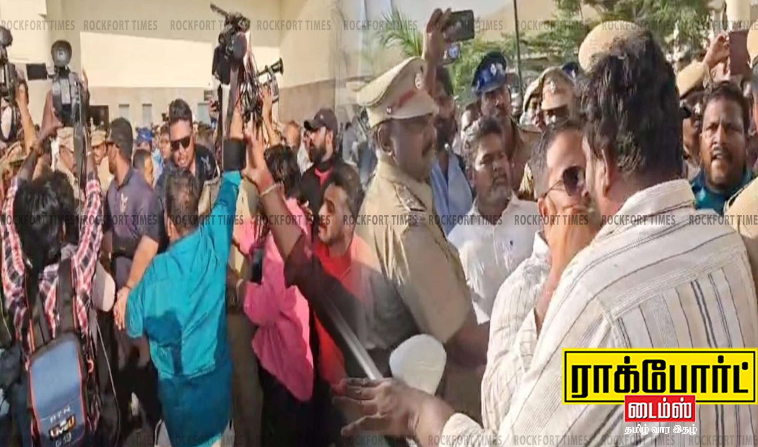 தமிழ்நாட்டில் ஏப்ரல் 23-ம் தேதி சட்டமன்றத் தேர்தல் நடைபெறவுள்ள நிலையில், புதிதாக களமிறங்கியுள்ள தவெக தலைவர் விஜய் பல்வேறு இடங்களில் தீவிர தேர்தல் பரப்புரையில் ஈடுபட்டு வருகிறார். அதன்படி இன்று (10-04-26) சிவகங்கை மாவட்டம் காரைக்குடியில் அவர் பிரச்சாரம் மேற்கொண்டார். மதுரை விமான நிலையத்தில் இருந்து காலை 10 மணியளவில் சாலை மார்க்கமாக பிரச்சார வாகனத்தில் காரைக்குடி சென்ற விஜய்க்கு ஏராளமான தொண்டர்கள் வரவேற்பு அளித்தனர். அதனைத் தொடர்ந்து அவர் பிரச்சார வாகனத்தில் நின்றபடி தொண்டர்களை சந்தித்து சென்றதால் அந்த பகுதியில் கடுமையான போக்குவரத்து நெரிசல் ஏற்பட்டது. மேலும், அனுமதிக்கப்பட்ட நேரத்தை கடந்ததால் திட்டமிட்ட இடத்தில் விஜய் பேசாமல் அங்கிருந்து திருச்சிக்கு சாலை மார்க்கமாக புறப்பட்டார். இதனால் அங்கு கூடியிருந்த தொண்டர்கள் ஏமாற்றம் அடைந்தனர். திருச்சி விமான நிலையத்தின் பொதுப் பகுதியில் செய்தி சேகரிக்க முயன்ற செய்தியாளர்களையும் ஊடகவியலாளர்களையும் பாதுகாவலர்கள் தடுத்து நிறுத்தினர். இந்த மோதலைத் தடுக்கவும் சூழ்நிலையை கட்டுக்குள் கொண்டு வரவும் முயன்ற காவல்துறையினரையும் விஜய்யின் பாதுகாவலர்கள் கீழே தள்ளிவிட்டதாகக் கூறப்படுகிறது. மேலும், அங்கிருந்த விமான நிலைய அதிகாரிகளிடமே அடையாள அட்டை (ID Card) கேட்டு பாதுகாவலர்கள் மிரட்டல் விடுத்ததாகவும் கூறப்படுகிறது. இதனால் அந்தப் பகுதியில் கடும் கூச்சல், குழப்பமும், பதற்றமும் நிலவியது.