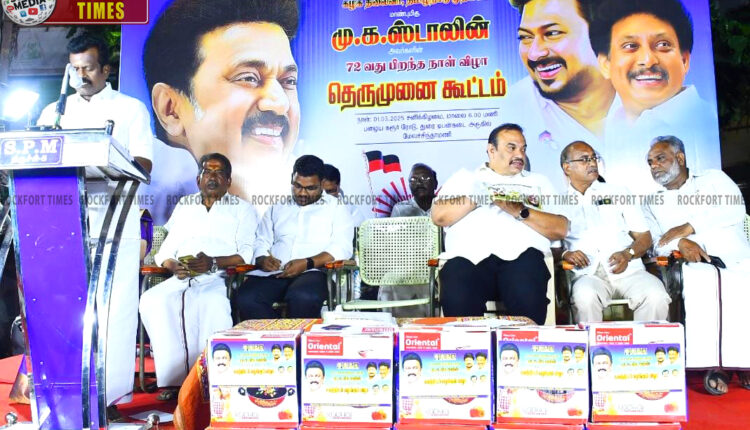 முதல்வர் மு.க.ஸ்டாலின் பிறந்தநாளை முன்னிட்டு திருச்சி தெற்கு மாவட்ட கழகச் செயலாளர் அமைச்சர் அன்பில் மகேஸ் பொய்யாமொழி வழிகாட்டுதலின்படி திருச்சி கிழக்கு மாநகரம் மலைக்கோட்டை பகுதி வார்டு எண் 12, 12 -அ வட்ட திமுக சார்பாக தெருமுனைப் பிரச்சார கூட்டம் பழைய கரூர் ரோடு மேலசிந்தாமணி பகுதியில் நடைபெற்றது. கூட்டத்திற்கு பகுதி கழகச் செயலாளர் மோகன் வரவேற்றார். 12 வட்ட செயலாளர் சிவக்குமார் 12 அ வட்ட செயலாளர் ஜெயச்சந்திரன் ஆகியோர் தலைமை தாங்கினர். கூட்டத்தில் சிறப்பு அழைப்பாளர்களாக கிழக்கு சட்டமன்ற உறுப்பினர் இனிகோ இருதயராஜ், கிழக்கு மாநகர திமுக செயலாளர் மு.மதிவாணன், தலைமைக் கழக செய்தி தொடர்பு துணைச் செயலாளர் சூர்யா கிருஷ்ணமூர்த்தி, இளம் பேச்சாளர் திருவெறும்பூர் குமரவேல் ஆகியோர் கலந்து கொண்டு சிறப்புரை ஆற்றினர்.