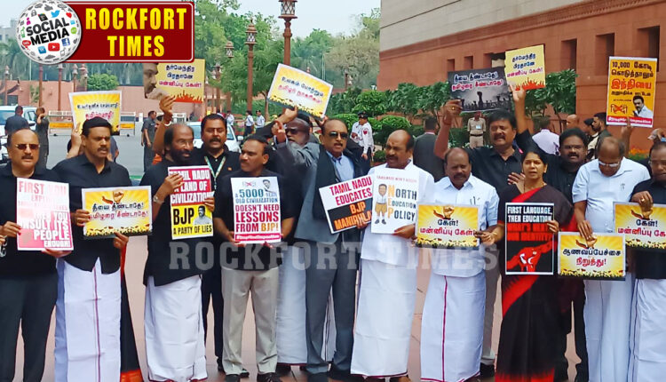 மத்திய அரசின் மும்மொழி கொள்கையை ஏற்க தமிழ்நாடு அரசு தொடர்ந்து மறுத்து வருகிறது. இதனால், கல்விக்காக தமிழ்நாட்டுக்கு வழங்கப்பட வேண்டிய நிதி ரூ.2,152 கோடியை மத்திய அரசு விடுவிக்காமல் காலம் தாழ்த்தி வருகிறது. புதிய கல்விக்கொள்கையை தமிழ்நாடு அரசு ஏற்காவிட்டால் கல்வி நிதி கிடையாது என்று மத்திய கல்வி அமைச்சர் தர்மேந்திர பிரதான் தெரிவித்துள்ளார். இதுதொடர்பாக திமுக எம்பிக்கள் நேற்று நாடாளுமன்றத்தில் கேள்வி எழுப்பியபோது மத்திய கல்வி அமைச்சர், தமிழக மாணவர்களை திமுக அரசு வஞ்சிக்கிறது, மாணவர்களின் எதிர் காலத்தை மாநில அரசு பாழாக்குகிறது என்று பேசினார். இதற்கு திமுக எம்பிக்கள் கடும் கண்டனம் தெரிவித்தனர். அப்போது கல்வி அமைச்சர், திமுக எம்பிக்கள் நாகரீகமற்றவர்கள் என்று கூறினார். இதனால் அவையில் கடும் அமளி ஏற்பட்டது. இதன் காரணமாக சிறிது நேரம் அவை ஒத்தி வைக்கப்பட்டது. இந்நிலையில் இரண்டாவது நாளாக நாடாளுமன்றம் இன்று(11-03-2025) கூடியபோது, புதிய கல்விக்கொள்கை விவகாரம், மும்மொழிக்கொள்கை, மத்திய அமைச்சர் தர்மேந்திர பிரதானின் பேச்சுக்கு கண்டனம் தெரிவித்து தி.மு.க. மற்றும் கூட்டணி கட்சி எம்.பி.க்கள் கருப்பு உடை அணிந்து, பதாகைகளை ஏந்தி நாடாளுமன்ற வளாகத்தில் ஆர்ப்பாட்டத்தில் ஈடுபட்டனர். இதனையடுத்து நாடாளுமன்ற இரு அவைகளும் தொடங்கியது. அவை தொடங்கியதில் இருந்தே மக்களவையில், மத்திய அமைச்சர் தர்மேந்திர பிரதானுக்கு எதிராக திமுக கூட்டணி கட்சி எம்.பி.க்கள் அவையில் முழக்கம் எழுப்பினர். மேலும் தர்மேந்திர பிரதான் மன்னிப்பு கோரவேண்டும் என வலியுறுத்தினர். அதைபோல தொகுதி சீரமைப்பு, கல்வி நிதி உள்ளிட்ட விவகாரங்கள் குறித்த நோட்டீஸ் மீது விவாதம் நடத்த அனுமதி மறுத்ததால் மாநிலங்களவையிலும் திமுக மற்றும் கூட்டணி கட்சிகள் அமளியில் ஈடுபட்டனர்.