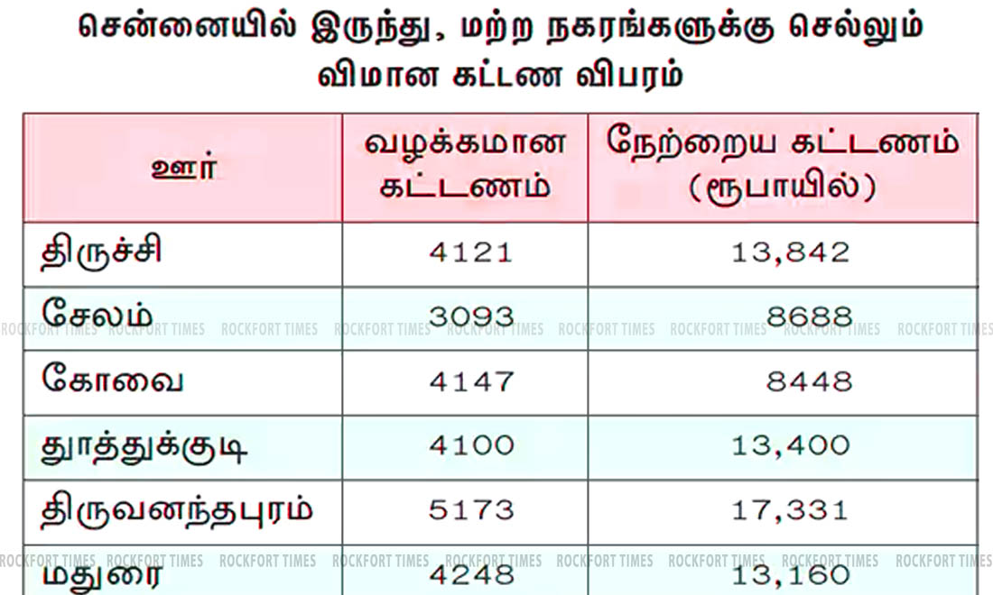 கிறிஸ்துமஸ் மற்றும் புத்தாண்டு விடுமுறை நாட்களை முன்னிட்டு வெளியூர்களில் தங்கி வேலை பார்க்கும் ஊழியர்கள் மற்றும் மாணவ, மாணவிகள் தங்களது சொந்த ஊர்களுக்கு படையெடுத்து வருகின்றனர். ஏற்கனவே ரயில்களில் ரிசர்வேஷன் முடிந்து விட்டதாலும், பஸ்களில் அதிக கூட்டம் காரணமாகவும் சிலர் விமானத்தில் செல்ல விமான நிலையத்தை அணுகினர். ஆனால், சென்னையில் இருந்து தமிழகத்தின் மற்ற நகரங்களுக்கு செல்ல நேரடி விமானங்கள் போதுமான எண்ணிக்கையில் இல்லாததால் விமான கட்டணம் பல மடங்கு உயர்ந்துள்ளது. அதோடு மட்டுமின்றி பெங்களூரு அல்லது திருவனந்தபுரம் வழியாக திருச்சி, கோவை, மதுரை செல்ல வேண்டிய நிலைக்கு பயணிகள் தள்ளப்பட்டுள்ளனர். சென்னையில் இருந்து தூத்துக்குடி செல்லும் விமானங்களில் நேற்றும், இன்றும் இருக்கைகள் நிரம்பி விட்டன. அதனால், துாத்துக்குடி செல்ல, திருவனந்தபுரம் சென்று அங்கிருந்து மாற வேண்டிய சூழல் ஏற்பட்டுள்ளது. டிக்கெட் கட்டணமும் அதிகரித்து, பயண நேரமும் கூடுதலாகி உள்ளது. மதுரை, திருச்சி, சேலம் ஆகிய நகரங்களுக்கு செல்ல வேண்டிய விமானங்களில், அனைத்து டிக்கெட்களும் காலியாகி விட்டதால், பயணிகள் சென்னையில் இருந்து பெங்களூரு வழியாக மதுரை, திருச்சி, சேலம் செல்ல வேண்டிய கட்டாய நிலை ஏற்பட்டுள்ளது.