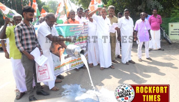 திருச்சி கலெக்டர் அலுவலகம் முன்பு சாலையில் பாலைக் கொட்டி விவசாயிகள் போராட்டம்…!