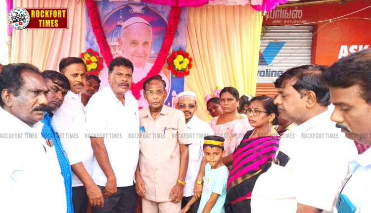 உலக கத்தோலிக்க கிறிஸ்தவர்களின் தலைவர் திருத்தந்தை போப் ஆண்டவர் பிரான்சிஸ் கடந்த 21 -ந் தேதி காலமானார். அவரது உடலுக்கு உலகத் தலைவர்கள் பலரும் அஞ்சலி செலுத்தி வருகின்றனர். அவரது உடல் நல்லடக்கம் இன்று (சனிக்கிழமை) வாடிகனில் நடக்கிறது. இந்தநிலையில் திருச்சி கிழக்கு மாவட்ட கிறிஸ்தவ நல்லெண்ண இயக்கம் சார்பில் தலைமை தபால் நிலையம் அருகில் அவருக்கு அஞ்சலி செலுத்தும் நிகழ்ச்சி நடந்தது. நிகழ்ச்சிக்கு கிழக்கு மாவட்ட செயலாளர் புஷ்பராஜ் தலைமை தாங்கி போப் பிரான்சிஸ் திருவுருவ படத்துக்கு