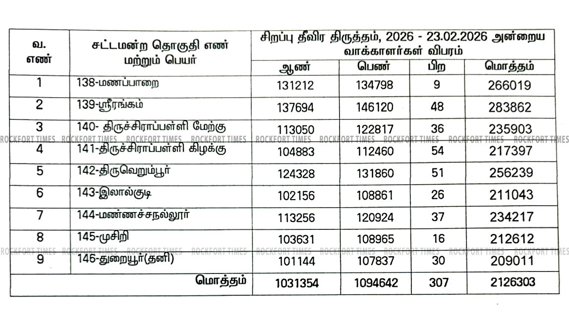 தமிழகத்தில் சிறப்பு தீவிர திருத்தத்திற்கு பிந்தைய இறுதி வாக்காளர் பட்டியல் இன்று( பிப்.23) வெளியிடப்பட்டது. திருச்சி மாவட்டத்திற்கு உட்பட்ட 9 சட்டமன்ற தொகுதி இறுதி வாக்காளர் பட்டியல் முழு விவரம் வருமாறு:
