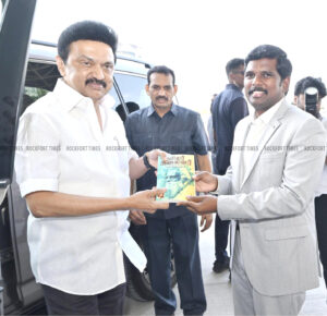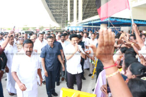 சிவகங்கை மாவட்டத்தில் இன்றும்(21-01-2025), நாளையும்(22-01-2025) நடைபெறும் அரசு மற்றும் கழகத்தின் பல்வேறு நிகழ்வுகளில் கலந்து கொள்வதற்காக திமுக தலைவரும், முதல்வருமான மு.க.ஸ்டாலின் சென்னையில் இருந்து விமானம் மூலம் திருச்சி விமான நிலையம் வந்தடைந்தார். அவருக்கு திமுக முதன்மை செயலாளரும், நகராட்சி நிர்வாகத்துறை அமைச்சருமான கே.என்.நேரு, திருச்சி தெற்கு மாவட்ட திமுக செயலாளரும், பள்ளிக் கல்வித் துறை அமைச்சருமான அன்பில் மகேஷ் பொய்யாமொழி தலைமையில் உற்சாக வரவேற்பு அளிக்கப்பட்டது.