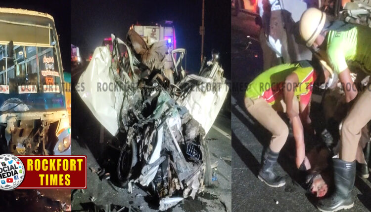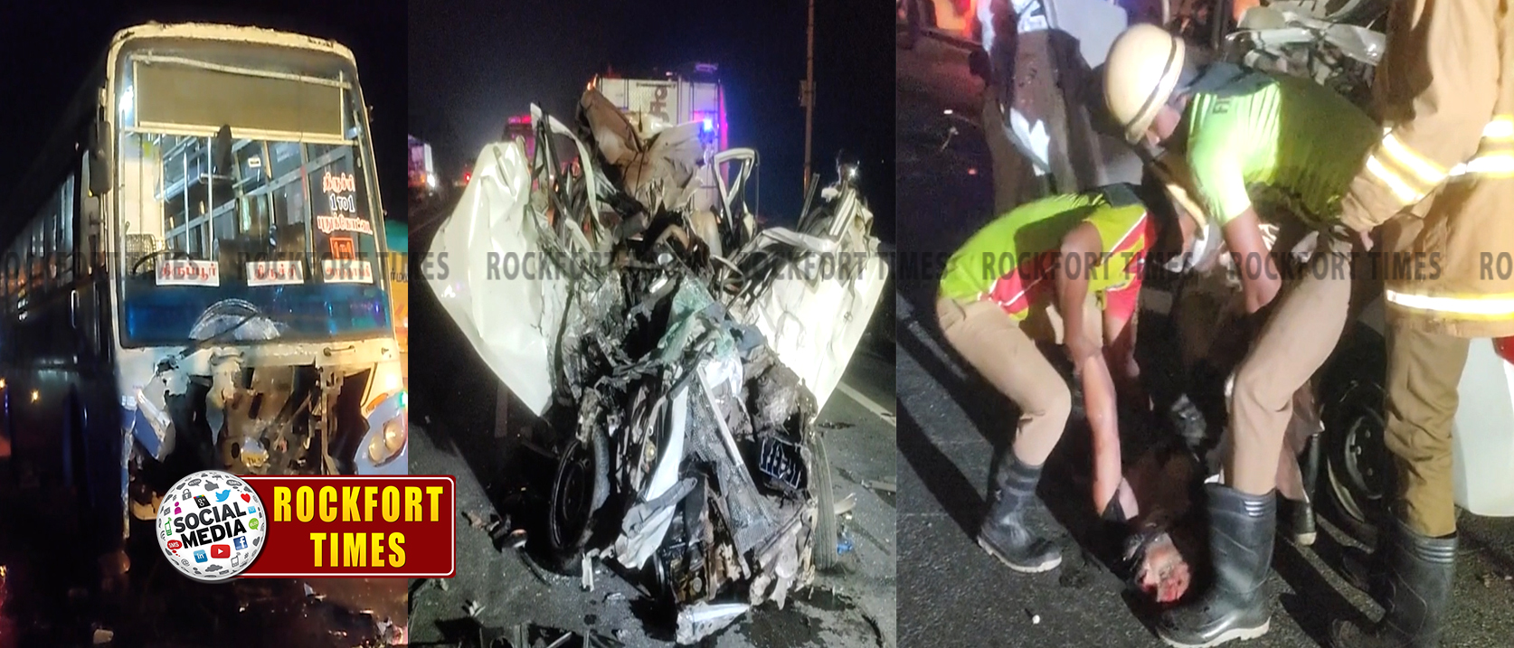 கரூர்-திருச்சி தேசிய நெடுஞ்சாலையில் குளித்தலை அருகே அரசு பேருந்தும் – காரும் நேருக்கு நேர் மோதி விபத்துக்குள்ளானது. இந்த விபத்தில் கார் அப்பளம் போல் நொறுங்கியது. இதில், காரில் பயணித்த ஒரே குடும்பத்தைச் சேர்ந்த 5 பேர் பரிதாபமாக உயிரிழந்தனர். விபத்தை பார்த்ததும் அந்த வழியாக சென்ற வாகன ஓட்டிகள் போலீசாருக்கும், தீயணைப்புத்துறையினருக்கும் தகவல் தெரிவித்தனர். அதன்பேரில் போலீசார் மற்றும் தீயணைப்பு வீரர்கள் சம்பவ இடத்திற்கு விரைந்து வந்து நீண்ட நேரம் போராடி பேருந்து அடியில் சிக்கிய காரை மீட்டனர். மேலும், விபத்தில் உடல் நசுங்கி உயிரிழந்த 5 பேரின் உடல்களை மீட்டு பிரேத பரிசோதனைக்காக அரசு மருத்துவமனைக்கு அனுப்பி வைத்தனர். இந்த விபத்து குறித்து போலீசார் வழக்குப்பதிவு செய்து விசாரணை மேற்கொண்டதில் கோவை மாவட்டம், குனியமுத்தூரைச் சேர்ந்த செல்வராஜ், அவரது மனைவி கலையரசி, மகள் அகல்யா, மகன் அருண் ஆகியோர் தஞ்சாவூர் மாவட்டம் ஒரத்தநாடு கீழையூர் பகுதியில் உள்ள கோயிலுக்கு சாமி கும்மிட சென்றபோது விபத்தில் சிக்கியது தெரியவந்தது. காரை ஓட்டிய ஈரோடு மாவட்டத்தைச் சேர்ந்த விஷ்ணு என்பவரும் விபத்தில் உயிரிழந்தார். இந்த விபத்து காரணமாக தேசிய நெடுஞ்சாலையில் போக்குவரத்து பாதிக்கப்பட்டது. போலீசார் விபத்தில் சிக்கிய வாகனங்களை அகற்றிய பிறகு போக்குவரத்தை சீர் செய்தனர்.