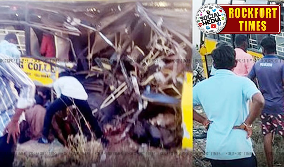 கரூர் மாவட்டம், தாந்தோணி வட்டத்தில் தனியார் கல்லூரி உள்ளது. இந்த கல்லூரியை சேர்ந்த மாணவர்கள் இன்று( மார்ச் 14) மாலை கல்லூரி முடிந்து கல்லூரி பேருந்தில் வீடு திரும்பி கொண்டு இருந்தனர். வெள்ளியணை அருகே உள்ள ரெயில்வே தண்டவாளத்தை அந்தப் பேருந்து கடக்க முற்பட்ட போது எதிர்பாராத விதமாக தண்டவாளத்தில் சிக்கிக்கொண்டது. அப்போது அந்த தண்டவாளத்தில் தனியார் சிமெண்ட் ஆலைக்கு ஜல்லி கற்களை ஏற்றிச்சென்ற சரக்கு ரெயில் வேகமாக வந்தது. கண்ணிமைக்கும் நேரத்திற்குள் கல்லூரி பேருந்து மீது அந்த சரக்கு ரயில் மோதியது. இந்த விபத்தில் பேருந்தில் இருந்த 18 கல்லூரி மாணவர்கள் படுகாயம் அடைந்தனர். அவர்கள் சிகிச்சைக்காக மருத்துவமனையில் அனுமதிக்கப்பட்டுள்ளனர். இந்த விபத்து குறித்து ரெயில்வே அதிகாரிகள் விசாரணை நடத்தி வருகின்றனர்.