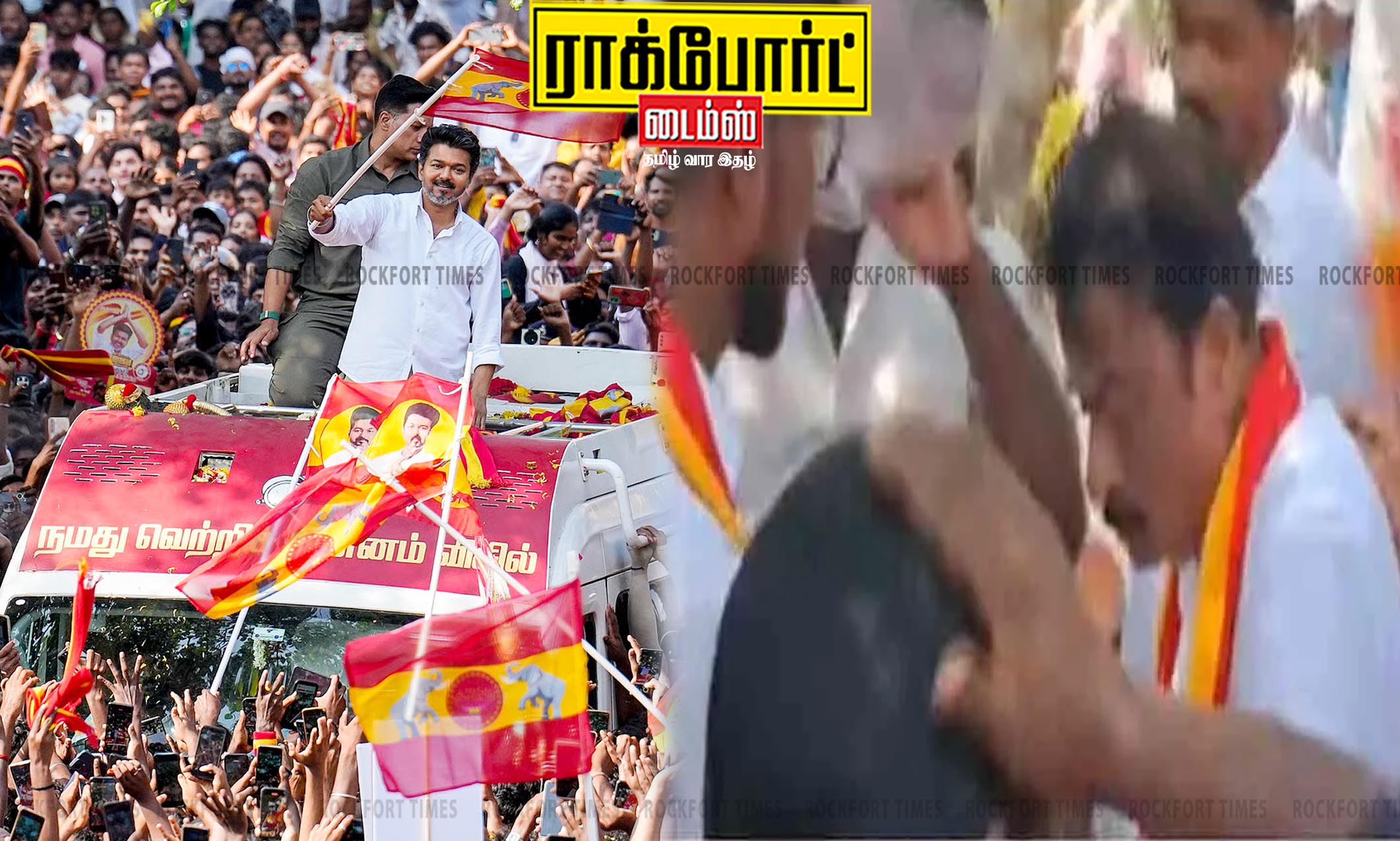 திருப்பூர் மாவட்டத்தில் உள்ள திருப்பூர் வடக்கு, திருப்பூர் தெற்கு. அவினாசி, பல்லடம், காங்கேயம், தாராபுரம், உடுமலை, மடத்துக்குளம் ஆகிய 8 சட்டமன்ற தொகுதிகளில் த.வெ.க. சார்பில் போட்டியிடும் வேட்பாளர்களை ஆதரித்து விஜய் இன்று(ஏப்ரல் 14 )மாலை திருப்பூரில் பிரச்சாரம் மேற்கொண்டார். இதற்காக சென்னையில் இருந்து இன்று விமானம் மூலம் கோவைக்கு வந்த விஜய், பின்னர் அங்கிருந்து கார் மூலம் அவினாசி சென்றார். அதன்பிறகு பிற்பகல் 3 மணியளவில் ஆட்டையாம்பாளையம் பிரிவில் இருந்து பிரசார வாகனத்தில் சென்று அவினாசி பழைய பஸ் நிலையம், புதிய பஸ் நிலையம் பகுதியில் ரோடு ஷோ சென்று வேனில் நின்றபடி வேட்பாளர்களை ஆதரித்து பிரச்சாரம் செய்தார். பின்னர் அங்கிருந்து தேசிய நெடுஞ்சாலை வழியாக பெருமாநல்லூர் நால்ரோடு சென்று அங்கு பிரச்சாரம் செய்தார். இதைத்தொடர்ந்து பூலுவப்பட்டி வரை ரோடு ஷோ நடத்தி ஆதரவு திரட்டினார். இந்தநிலையில், விஜய்யின் வருகைக்காக பெருமாநல்லூரில் காத்திருந்த த.வெ.க. வேட்பாளருக்கு மயக்கம் ஏற்பட்டது. அவருக்கு உடனடியாக முதலுதவி சிகிச்சை அளித்து குடிநீர், ஓ.ஆர்.எஸ். வழங்கினர். அவர் தவிர 7 பெண்கள் உள்பட 9 பேர் அடுத்தடுத்து மயக்கம் அடைந்தனர். நீண்ட நேரம் வெயிலில் காத்திருந்ததால் அவர்களுக்கு மயக்கம் ஏற்பட்டதாக கூறப்படுகிறது.