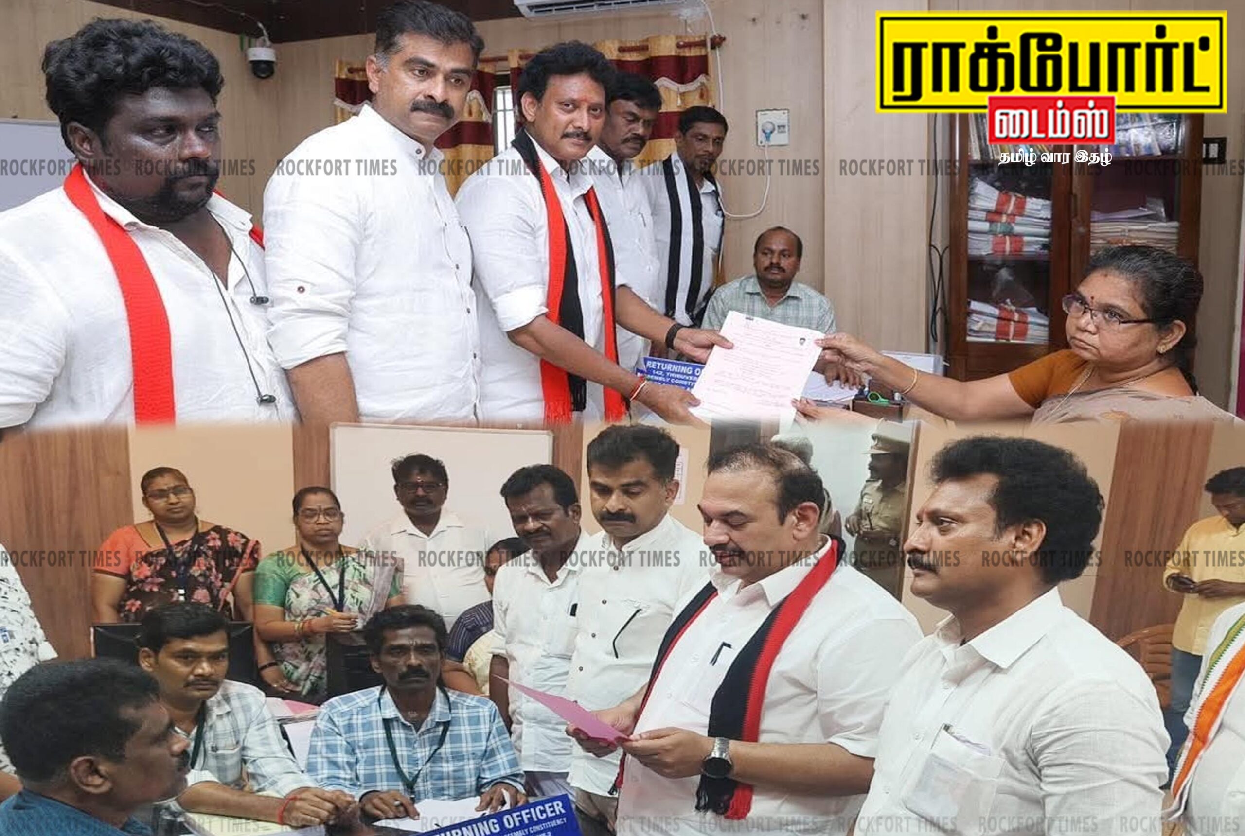 திருச்சி மாவட்டம், திருவெறும்பூர் சட்டமன்ற தொகுதி திமுக வேட்பாளராக அமைச்சர் அன்பில் மகேஷ் பொய்யாமொழியும், திருச்சி கிழக்கு தொகுதியில் இனிகோ இருதயராஜும் மீண்டும் போட்டியிடுகிறார்கள். வேட்பாளர்களாக அறிவிக்கப்பட்ட நாள் முதல் தொகுதி முழுவதும் தீவிர பிரச்சாரத்தில் ஈடுபட்டு வருகின்றனர். இந்தநிலையில் இருவரும் இன்று(04-04-2026) தங்களது வேட்பு மனுக்களை தாக்கல் செய்தனர். அமைச்சர் அன்பில் மகேஷ் பொய்யாமொழி, பெல் தொழிற்சங்க அலுவலகத்தில் இருந்து கூட்டணி கட்சி நிர்வாகிகளுடன் மேளதாளங்கள் முழங்க, வான வேடிக்கைகளுடன், கரகாட்டம் மற்றும் தாரை தப்பட்டைகள் முழங்க ஊர்வலமாக வந்து திருவெறும்பூர் தாலுகா அலுவலகத்தில் தேர்தல் நடத்தும் அலுவலரான அமுதாவிடம், தனது வேட்பு மனுவை தாக்கல் செய்தார். மாற்று வேட்பாளராக முன்னாள் எம்எல்ஏ கே.என்.சேகரன் வேட்பு மனு தாக்கல் செய்தார். பின்னர் அமைச்சர் அன்பில் மகேஷ் பொய்யாமொழி செய்தியாளர்களிடம் கூறுகையில், திமுக சார்பில் இதுவரை மேற்கொள்ளப்பட்டுள்ள திட்டங்கள், தற்போது அறிவிக்கப்பட்டுள்ள தேர்தல் வாக்குறுதிகள், கடந்த ஐந்து ஆண்டுகளாக சட்டமன்ற தொகுதியில் தான் செய்த திட்ட பணிகளை எடுத்துக் கூறி வாக்கு சேகரித்து வருகிறேன். இதுவரை ரூ.450 கோடி மதிப்பிலான வளர்ச்சி திட்டப் பணிகளை தொகுதிக்கு செய்து உள்ளேன். அதேபோல் அரியமங்கலம் பொதுமக்களின் நீண்ட கால பிரச்சனையாக இருக்கும் குப்பை