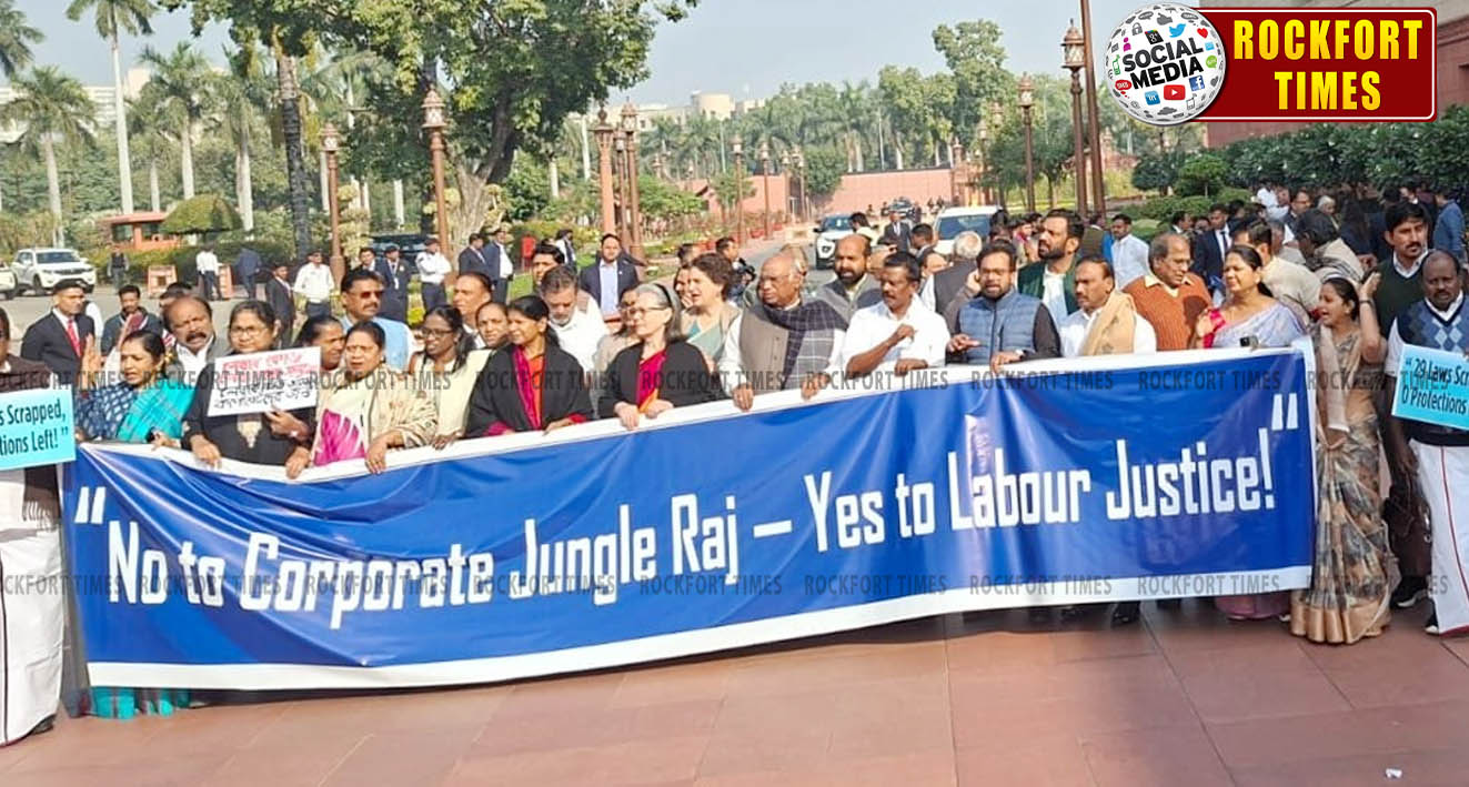 இந்தநிலையில், புதிய தொழிலாளர் சட்டங்களுக்கு எதிர்ப்பு தெரிவித்து நாடாளுமன்ற வளாகத்தில் எதிர்க்கட்சிகளைச் சேர்ந்த எம்பிக்கள் போராட்டத்தில் ஈடுபட்டனர். கடந்த 2020 ஆம் ஆண்டு நாடாளுமன்றத்தில் நிறைவேற்றப்பட்ட 4 புதிய தொழிலாளர் சட்டங்கள் நவம்பர் மாதம் முதல் அமலுக்கு வந்தன. இதில், தொழிலாளர் நலன், சமூக பாதுகாப்பு கருதி 29 தொழிலாளர் சட்டங்களை ஒருங்கிணைத்து 4 சட்டத் தொகுப்புகள் உருவாக்கப்பட்டுள்ளதாக மத்திய தொழிலாளர் மற்றும் வேலைவாய்ப்பு அமைச்சகம் தெரிவித்தது. இந்த சட்டங்கள் தொழிலாளர்களுக்கு பாதிப்பை ஏற்படுத்தும் வகையில் இருப்பதாக காங்கிரஸ், திமுக, இடதுசாரிகள் உள்ளிட கட்சிகள் எதிர்ப்பு தெரிவித்து வருகின்றன. இந்த நிலையில், நாடாளுமன்ற குளிர்காலக் கூட்டத்தொடரின் மூன்றாம் நாள் அமர்வு தொடங்குவதற்கு முன்னதாக இந்தியா கூட்டணிக் கட்சிகளைச் சேர்ந்த எம்.பி.க்கள், புதிய தொழிலாளர் சட்டத் தொகுப்புகளுக்கு எதிர்ப்பு தெரிவித்து போராட்டம் நடத்தினர். கார்ப்பரேட் காட்டாட்சி வேண்டாம், தொழிலாளர்களுக்கு நீதி வேண்டும் என்ற பேனருடன் எதிர்க்கட்சி எம்பிக்கள் முழக்கமிட்டு தொழிலாளர் சட்டத் தொகுப்புக்கு எதிர்ப்பு தெரிவித்தனர். காங்கிரஸ் நாடாளுமன்ற குழு தலைவர் சோனியா காந்தி, மாநிலங்களவை எதிர்க்கட்சி தலைவர் மல்லிகார்ஜுன கார்கே உள்ளிட்டோர் கலந்து கொண்டனர்.