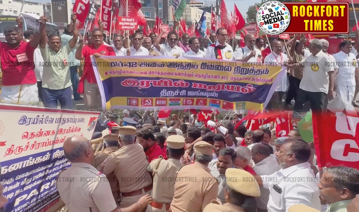 மத்திய அரசின், தொழிலாளர் மற்றும் விவசாய விரோத கொள்கைகளை கண்டித்து அனைத்து தொழிற்சங்கங்கள் சார்பில் நாடு தழுவிய அளவில் பொது வேலை நிறுத்தம் மற்றும் ரயில் மறியல் போராட்டம் இன்று(12-02-2026) நடைபெற்றது. அதேபோல திருச்சி ஜங்ஷன் ரயில் நிலையம் முன்பு ஆயிரத்திற்கும் மேற்பட்ட தொழிற்சங்கத்தினர் போராட்டத்தில் ஈடுபட்டனர். முன்னதாக அவர்கள் திருச்சி மத்திய பேருந்து நிலையத்திலிருந்து ரயில் நிலையம் வரை நடந்து வந்தனர். பின்னர் அவர்கள் ரயில் நிலையத்திற்குள் நுழைய முயன்ற போது அங்கு பாதுகாப்பு பணியில் ஈடுபட்ட போலீசார் அவர்களை தடுத்து நிறுத்தினர். இதனால் இரு தரப்பினருக்கும் இடையே தள்ளுமுள்ளு ஏற்பட்டது. அப்போது சிலர் ரயில் நிலையத்திற்குள் ஓடினர். போலீசார் அவர்களை அங்கிருந்து அப்புறப்படுத்தினர். இந்த சம்பவத்தால் ரயில் நிலையத்தில் சிறிது நேரம் பரபரப்பு நிலவியது.