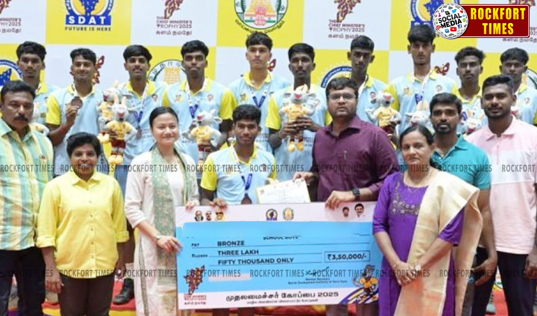 2025-26-ம் ஆண்டிற்கான “தமிழ்நாடு முதலமைச்சர் கோப்பை” விளையாட்டுப் போட்டிகள் மாநிலம் முழுவதும் 26.08.2025 முதல் 12.09.2025 வரை பொதுப்பிரிவு, பள்ளி, கல்லூரி மாணவ, மாணவிகள், மாற்றுத்திறனாளிகள் மற்றும் அரசு ஊழியர்கள் என 5 பிரிவுகளில் ஆண், பெண் இருபாலரும் பங்கேற்கும் வகையில் 32 விளையாட்டுக்கள் 37 வகைகளில் மாவட்ட, மண்டல அளவில் நடைபெற்றது. இதனை தொடர்ந்து தற்போது மாநில அளவிலான போட்டிகள் 13 மாவட்டங்களில் 02.10.2025 முதல் 14.10.2025 வரை நடைபெற்று வருகிறது. மாவட்ட அளவிலான குழுப் போட்டிகளில் கலந்துகொண்டு தேர்வு செய்யப்பட்ட வீரர்கள் மற்றும் வீராங்கனைகள் மாநில அளவிலான கைப்பந்து போட்டிகளில் பங்கேற்பதற்கு, 38 மாவட்டங்களிலிருந்து 555 வீரர்கள் மற்றும் 570 வீராங்கனைகள், பங்கேற்க உள்ளனர். இப்போட்டிகள் 07.10.2025 முதல் 10.10.2025 வரை மாணவர்களுக்கும், 10.10.2025 முதல் 13.10.2025 வரை மாணவிகளுக்கும் திருச்சி அண்ணா விளையாட்டரங்கில் நடைபெற்று வருகிறது. இப்போட்டிகளில் பள்ளி மாணவர்களுக்கான கைப்பந்து போட்டிகள் 07.10.2025 முதல் 10.10.2025 வரை நடைபெற்றது. இப்போட்டிகளில் சென்னை மாவட்ட அணி முதலிடமும், தஞ்சாவூர் மாவட்ட அணி இரண்டாம் இடமும், திருச்சி மாவட்ட அணி மூன்றாம் இடமும் பெற்றன. முதலிடம் பிடித்தவர்களுக்கு தலா ரூ.75 ஆயிரம் வீதம் 14 நபர்களுக்கு ரூ.10.50 லட்சமும், இரண்டாமிடம் பிடித்தவர்களுக்கு தலா ரூ.50 ஆயிரம் வீதம் 14 நபர்களுக்கு ரூ.7 லட்சமும் மற்றும் மூன்றாமிடம் பிடித்தவர்களுக்கு தலா ரூ.25 ஆயிரம் வீதம் 14 நபர்களுக்கு ரூ.3.50 லட்சமும் வங்கி கணக்கு வாயிலாக வழங்கப்பட உள்ளது.இந்த போட்களில் வெற்றி பெற்ற அணிகளுக்கு இன்று (10.10.2025) திருச்சி அண்ணா விளையாட்டரங்கில் நடைபெற்ற விழாவில் மாவட்ட ஆட்சியர் வே.சரவணன் பங்கேற்று வெற்றி பெற்ற அணி வீரர்களுக்கு பதக்கம், பாராட்டுச்சான்றிதழ் மற்றும் பரிசு தொகைகளை வழங்கி பாராட்டினார். இந்நிகழ்வில், உதவி ஆட்சியர் (பயிற்சி) சேஷத்ரிமயும் தீபிசானு, மாவட்ட விளையாட்டு அலுவலர் ஞானசுகந்தி மற்றும் பயிற்சியாளர்கள், மேலாளர்கள், விளையாட்டு வீரர்கள் கலந்து கொண்டனர்.