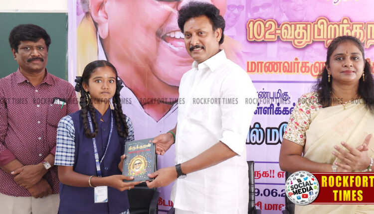 கருணாநிதி பிறந்த நாளை முன்னிட்டு நடைபெற்ற பேச்சுப் போட்டியில் வெற்றி பெற்ற மாணவ- மாணவிகளுக்கு பரிசு…! * அமைச்சர் அன்பில் மகேஷ் பொய்யாமொழி வழங்கினார்