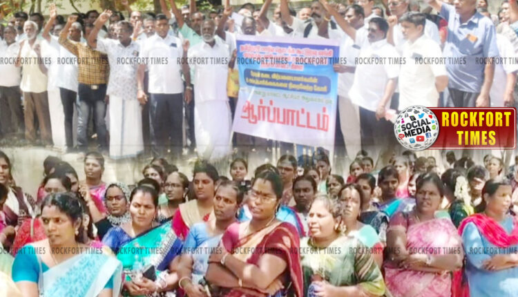 திருச்சியில் ரேஷன் கடை ஊழியர்கள் ஆர்ப்பாட்டம்- புளூடூத் முலம் பொருட்கள் விற்பனை செய்வதை நீக்க வலியுறுத்தல்…!