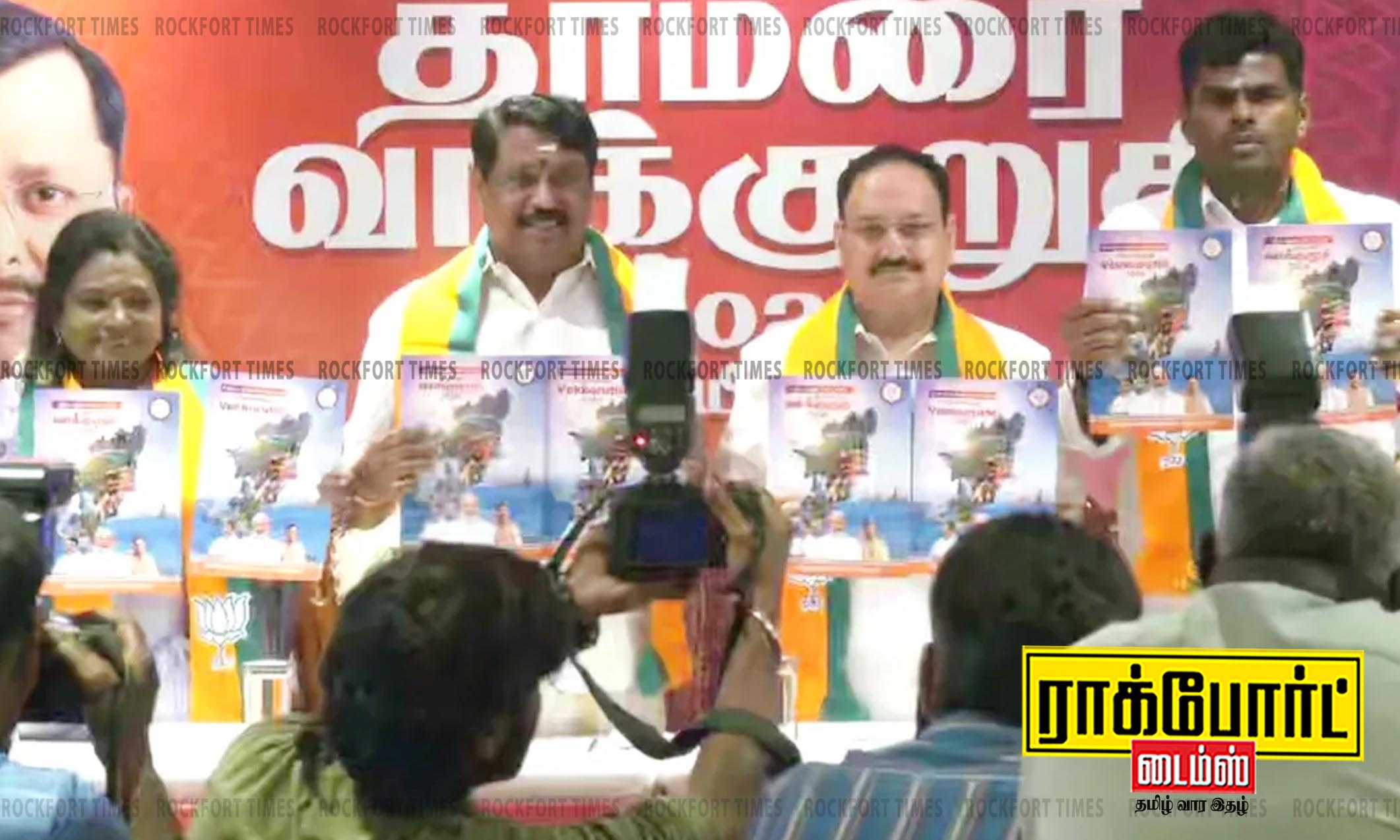 தமிழ்நாடு சட்டப்பேரவைத் தேர்தலில் அதிமுக தலைமையிலான தேசிய ஜனநாயகக் கூட்டணியில் பாரதிய ஜனதா கட்சி 27 தொகுதிகளில் போட்டியிடுகிறது. ஏற்கனவே, அதிமுக சார்பில் தேர்தல் அறிக்கை வெளியிடப்பட்டு உள்ளது. அதேபோல, சென்னை பாஜக அலுவலகத்தில் அக்கட்சியின் தேர்தல் அறிக்கையை மத்திய அமைச்சர் ஜெ.பி. நட்டா இன்று( ஏப்.14) காலை வெளியிட்டார். இந்த நிகழ்வில், பாஜக மாநில தலைவர் நயினார் நாகேந்திரன், மூத்த தலைவர்கள் தமிழிசை செளந்தரராஜன், அண்ணாமலை உள்ளிட்டோர் கலந்து