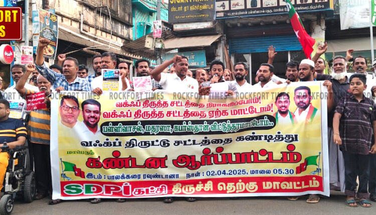 வக்பு திருத்தச் சட்டத்தை திரும்ப பெற வலியுறுத்தி திருச்சியில் எஸ்.டி.பி.ஐ. கட்சியினர் ஆர்ப்பாட்டம்…!