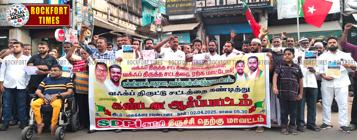 வக்பு திருத்த சட்டத்தை திரும்ப பெற வேண்டும் என்பன உள்ளிட்ட பல்வேறு கோரிக்கைகளை வலியுறுத்தி திருச்சி தெற்கு மாவட்ட எஸ்.டி.பி.ஐ. கட்சி சார்பாக திருச்சியில் கண்டன ஆர்ப்பாட்டம் மாவட்ட தலைவர் தமீம் அன்சாரி தலைமையில் நடைபெற்றது. மாவட்ட துணைத் தலைவர்கள் ரஹீம், தளபதி அப்பாஸ் ஆகியோர் முன்னிலை வகித்தனர். மாவட்ட பொதுச் செயலாளர் இன்ஜினியர் முகமது சித்திக் வரவேற்றார். மாநில பேச்சாளர் முபாரக் அலி கண்டன உரை ஆற்றினார். மாவட்ட ஊடக ஒருங்கிணைப்பாளர் அப்துல் காதர் (பாபு), மாவட்ட செயற்குழு உறுப்பினர் ந.சிராஜ் ஆகியோர் கண்டன கோஷங்கள் எழுப்பினர். மாவட்ட செயலாளர் ஜமால் முஹம்மது தொகுத்து வழங்கினார்.