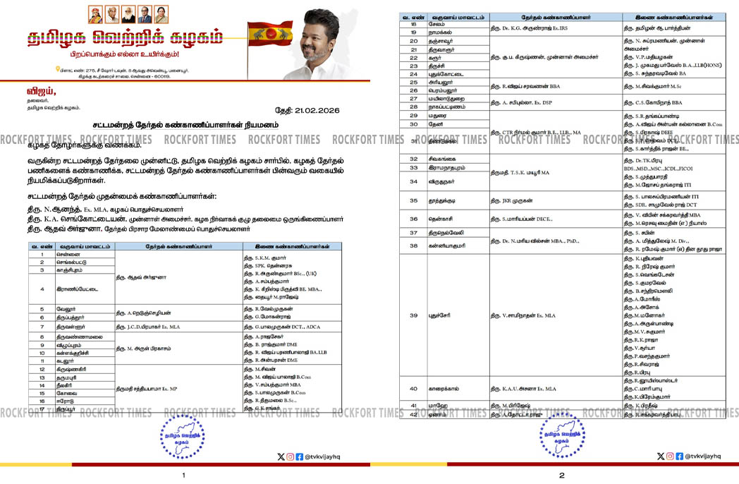 த.வெ.க. தலைவர் விஜய் வெளியிட்டுள்ள அறிக்கையில், வருகின்ற சட்டமன்றத் தேர்தலை முன்னிட்டு தமிழக வெற்றிக் கழகம் சார்பில், கழகத் தேர்தல் பணிகளைக் கண்காணிக்க சட்டமன்றத் தேர்தல் கண்காணிப்பாளர்கள் பின்வரும் வகையில் நியமிக்கப்படுகிறார்கள்.