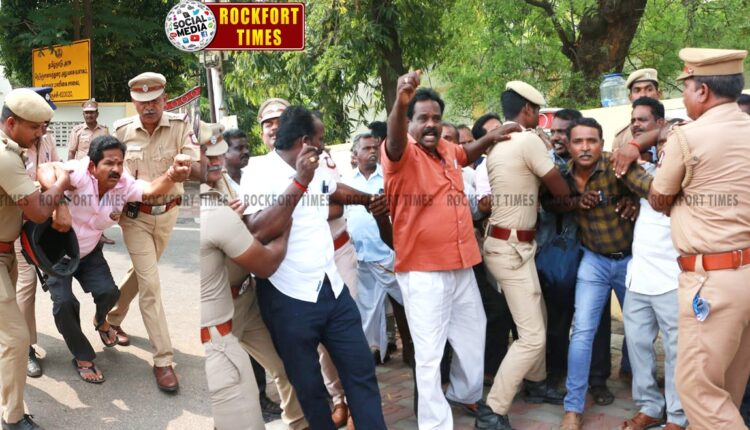 சாலைப்பணியாளர்களின் 41 மாத பணி நீக்க காலத்தை சென்னை உயர்நீதிமன்ற ஆணையின்படி பணிக்காலமாக முறைப்படுத்தி ஆணை வழங்க வேண்டும். மாநில நெடுஞ்சாலை துறை ஆணையத்தை கலைத்துவிட்டு, அரசாணை எண் 140 ஐ ரத்து செய்ய வேண்டும். மாநில நெடுஞ்சாலைகளில் 210 சுங்கச்சாவடி அமைத்து கார்ப்பரேட் கம்பெனி சுங்கவரி வசூல் செய்ய அனுமதிக்க கூடாது என்பன உள்ளிட்ட பல்வேறு கோரிக்கைகளை வலியுறுத்தி திருச்சியில் இன்று (01-04-2025) தமிழ்நாடு நெடுஞ்சாலைத் துறை சாலை பணியாளர்கள் சங்கம் சார்பில் திருச்சி நெடுஞ்சாலைத்துறை கண்காணிப்பு பொறியாளர் அலுவலகம் முன்பு ஆர்ப்பாட்டம் நடைபெற்றது. இதில், திருச்சி மாவட்ட தலைவர் ஜீவானந்தம் மற்றும் புதுக்கோட்டை, தஞ்சாவூர், திருவாரூர், நாகப்பட்டினம், மயிலாடுதுறை மாவட்ட தலைவர்கள் கருப்பையா, ஜனார்த்தனன், மகாலிங்கம், கணேசன், ரமேஷ், மாவட்ட பொருளாளர்கள் பிரேம்குமார், கருணாநிதி, ரவிச்சந்திரன், ஸ்ரீதர், ஜவகர், மாநில செயலாளர் பழனிச்சாமி மற்றும் மாவட்ட செயலாளர்கள் இளங்கோவன், முத்துக்கருப்பன், சந்திரசேனன், பொன்முடி, உதயகுமார், வெங்கடேசன், தமிழ்நாடு அரசு பணியாளர் சங்க திருச்சி மாவட்ட தலைவர் பால்பாண்டி, மாவட்ட செயலாளர் நவநீதன், மாநில துணைத்தலைவர் செல்வராணி, மாநில பொதுச் செயலாளர் அம்சராஜ், மாவட்ட பொருளாளர் பிரான்சிஸ் உள்ளிட்டோர் பங்கேற்றனர். அப்போது அவர்கள் திடீரென அரசாணை எண் 140 ஐ தீயிட்டு கொளுத்த முயன்றனர். அப்போது அங்கு பாதுகாப்பு பணியில் ஈடுபட்ட போலீசார், போராட்டக்காரர்கள் 50க்கும் மேற்பட்ட வரை கைது செய்து ஒரு தனியார் திருமண மண்டபத்தில் தங்க வைத்தனர். இந்தப் போராட்டத்தால் சிறிது நேரம் பரபரப்பு ஏற்பட்டது.