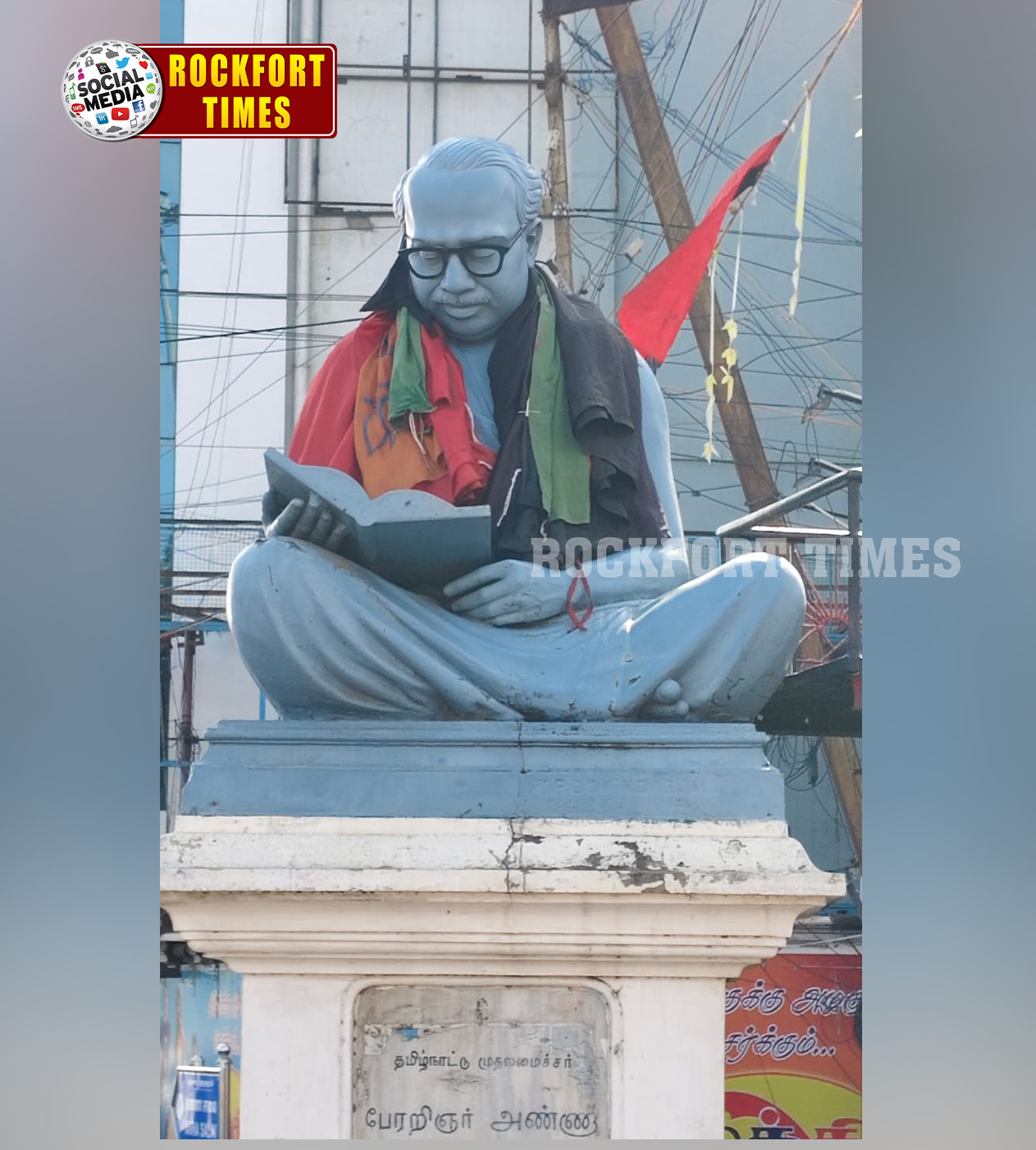 தஞ்சாவூர் பழைய பேருந்து நிலையம் அருகே அண்ணா சிலை உள்ளது. இந்த அண்ணா சிலை அருகே இன்று(05-04-2025) திமுக மகளிர் அணி கூட்டம் நடைபெறுகிறது. இதற்காக அந்த பகுதி முழுவதும் தி.மு.க. கொடிகள் கட்டப்பட்டு உள்ளன. இந்தசூழலில், அண்ணா சிலையின் கழுத்தில் திமுக மற்றும் பாஜகவின் கொடிகளை மர்ம நபர்கள் அணிவித்து விட்டு சென்றிருக்கின்றனர். இதனை இன்று காலை கண்ட கட்சியினர் அதிர்ச்சியடைந்தனர். இதுபற்றி உடனடியாக போலீசாருக்கு தகவல் தெரிவிக்கப்பட்டதையடுத்து, விரைந்து வந்த போலீசார் அண்ணா சிலையின் கழுத்தில் கிடந்த திமுக – பாஜக கொடிகளை அகற்றினர். நள்ளிரவில் யாரோ மர்மநபர்கள் அண்ணா சிலை மீது திமுக – பாஜக கொடியை போர்த்தி சென்றிருக்கலாம் என்று போலீசார் தெரிவித்தனர். இதுபற்றி போலீசார் விசாரணையை தொடங்கி உள்ளனர். இந்த சம்பவம் தஞ்சாவூரில் பெரும் பரபரப்பை ஏற்படுத்தியது.