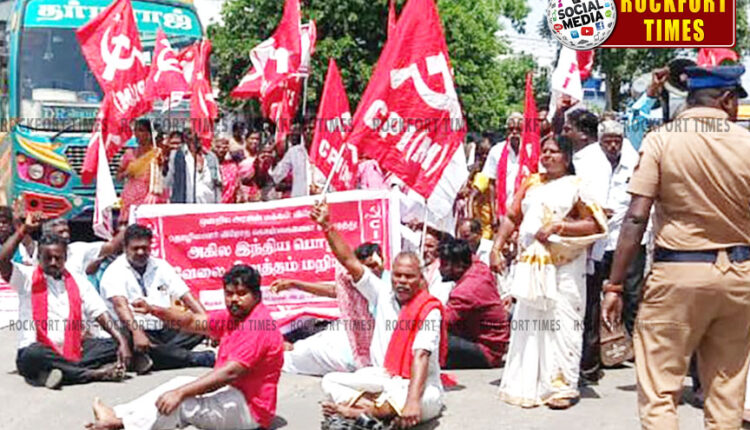 பொதுத்துறை நிறுவனங்களை தனியார் மயமாக்குவதை கைவிட வேண்டும், மின்வாரியம் உட்பட மத்திய மாநில பொதுத்துறை நிறுவனங்களில் உள்ள லட்சக்கணக்கான காலி பணியிடங்களை நிரப்ப வேண்டும், இளைஞர்களுக்கு வேலை வழங்க வேண்டும் என்பன உட்பட 17 அம்ச கோரிக்கைகளை வலியுறுத்தி அனைத்து மத்திய தொழிற்சங்கங்கள் சார்பில் இன்று( ஜூலை 9) நாடு தழுவிய அளவில் போராட்டம், பேரணி, மறியல் ஆகியவை நடைபெற்றன. தமிழகத்தில் அகில இந்திய ஜனநாயக மாதர் சங்கம், இந்திய ஜனநாயக வாலிபர் சங்கம் மற்றும் மாற்றுத்திறனாளிகள் அமைப்பு, அகில இந்திய விவசாய தொழிலாளர் சங்கம் சார்பில் தொழிற் சங்கங்களின் தேசம் காக்கும் போராட்டம் நடைபெற்றது. அதேபோல திருச்சி மாவட்டம், புள்ளம்பாடியில் அண்ணா சிலை முன்பு போராட்டம் நடைபெற்றது. போராட்டத்திற்கு மாற்றுத் திறனாளிகள் அமைப்பு செயலாளர் ரஜினிகாந்த் தலைமை தாங்கினார். அகில இந்திய மாதர் சங்க செயலாளர் மல்லிகா, இந்திய ஜனநாயக வாலிபர் சங்க ஒன்றிய செயலாளர் வினோத், கட்டுமான சங்க நிர்வாகி கோவிந்தராஜ், விவசாய தொழிலாளர் சங்க நிர்வாகி குமார் ஆகியோர் முன்னிலையில் போராட்டம் நடைபெற்றது. போராட்டம் அண்ணா சிலையில் தொடங்கி கடைவீதி வழியாக சகாயமாதா பேருந்து நிலையத்தை அடைந்து திருச்சி-