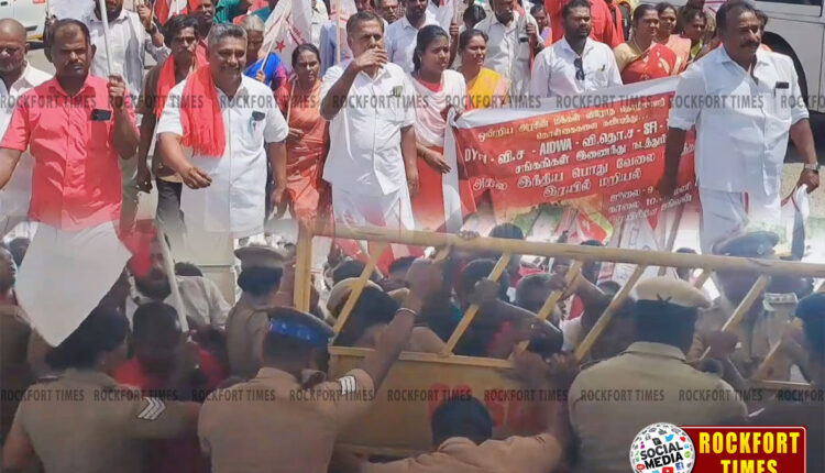 போலீசாரின் பாதுகாப்பு அரணை உடைத்துக் கொண்டு திருச்சி ரயில் நிலையத்திற்குள் புகுந்து மறியலில் ஈடுபட்ட தொழிற்சங்கத்தினர் கைது…! (வீடியோ இணைப்பு)