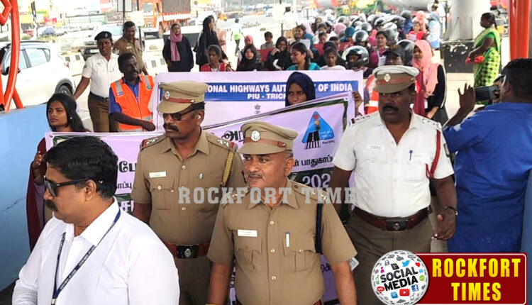 ஆண்டுதோறும் ஜனவரி மாதம் தேசிய சாலை பாதுகாப்பு மாதமாக கடைபிடிக்கப்பட்டு வருகிறது. அதன்படி, திருச்சி கிழக்கு வட்டார போக்குவரத்து அலுவலர் பழனியப்பன் தலைமையில் சமயபுரம் டோல்பிளாசா அருகே சாலை பாதுகாப்பு குறித்து விழிப்புணர்வு பேரணி மற்றும் துண்டு பிரசுரங்கள் வழங்கி பொதுமக்களிடையே விழிப்புணர்வு ஏற்படுத்தப்பட்டது. இதில், கல்லூரி மாணவிகள் 150க்கும் மேற்பட்டோர் கலந்து கொண்டு சாலை பாதுகாப்பு குறித்த விழிப்புணர்வு வாசகங்களுடன் பேரணியாக சென்று பொதுமக்களிடையே துண்டு பிரசுரங்களை வழங்கி விழிப்புணர்வு ஏற்படுத்தினர். பின்னர், அனைவரும் போக்குவரத்து விதிமுறை உறுதிமொழி ஏற்றுக்கொண்டனர். நிகழ்ச்சியில், வட்டார போக்குவரத்து ஆய்வாளர்கள் செந்தில், நடராஜன் மற்றும் போக்குவரத்து துறையினர், ஜமால் முகமது கல்லூரி மாணவர்கள் உள்ளிட்ட பலர் கலந்து கொண்டனர்.