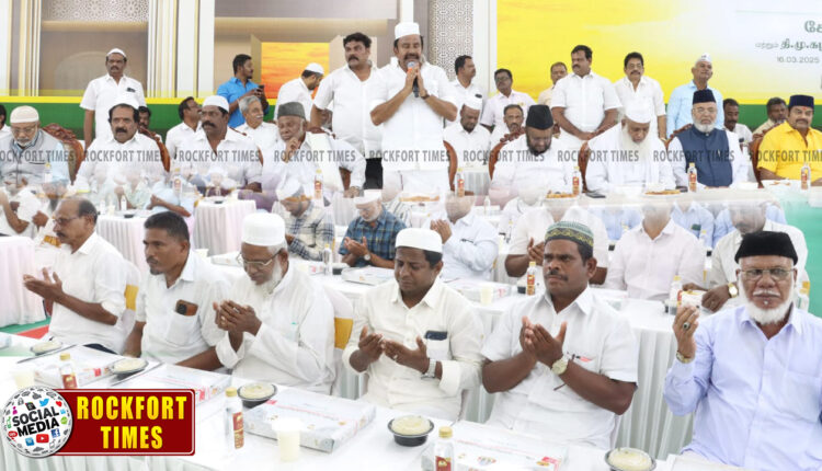 திருச்சி, தென்னூர் உழவர் சந்தை மைதானத்தில் திமுக மற்றும் கூட்டணி கட்சிகள் சார்பில் இப்தார் நோன்பு திறப்பு நிகழ்ச்சி நடைபெற்றது. நிகழ்ச்சிக்கு இந்திய யூனியன் முஸ்லிம் லீக் தலைவர் பேராசிரியர் கே.எம்.காதர் மொய்தீன் தலைமை தாங்கினார். மனித நேய மக்கள் கட்சி தலைவர் பேராசிரியர் ஜவாஹிருல்லா முன்னிலை வகித்தார். திமுக முதன்மை செயலாளரும், நகராட்சி நிர்வாகத்துறை அமைச்சருமான கே.என்.நேரு சிறப்பு அழைப்பாளராக கலந்து கொண்டார். ஜமாத்துல் உலமா சபை மாவட்ட தலைவர் முகமது ரூஹில் ஹக் ஹஜ்ரத் ரஷாதி வாழ்த்துரை வழங்கினார். இந்நிகழ்ச்சியில் இஸ்லாமிய அமைப்புகள் சார்பில், பஞ்சப்பூர் பேருந்து நிலையத்தில் மூன்று மதத்தினரும் வழிபாடு நடத்துவதற்கான இந்து கோவில், கிறிஸ்தவ ஆலயம், பள்ளிவாசல் என மூன்றும் ஒரே இடத்தில் அமைத்து தர வேண்டும் என்ற கோரிக்கையை முன் வைத்தனர். இதுகுறித்து பேசிய அமைச்சர் கே.என்.நேரு, முதலமைச்சரிடம் இந்த கோரிக்கையை முன் வைத்து விரைவில் நிறைவேற்றுவதற்கான நடவடிக்கை எடுக்கப்படும் என்று உறுதி அளித்தார்.