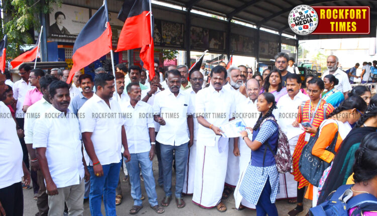 இந்தி திணிப்பை எதிர்த்து துண்டு பிரசுரங்கள்…-திருச்சி கிழக்கு மாநகர திமுக செயலாளர் மதிவாணன் வழங்கினார்..!